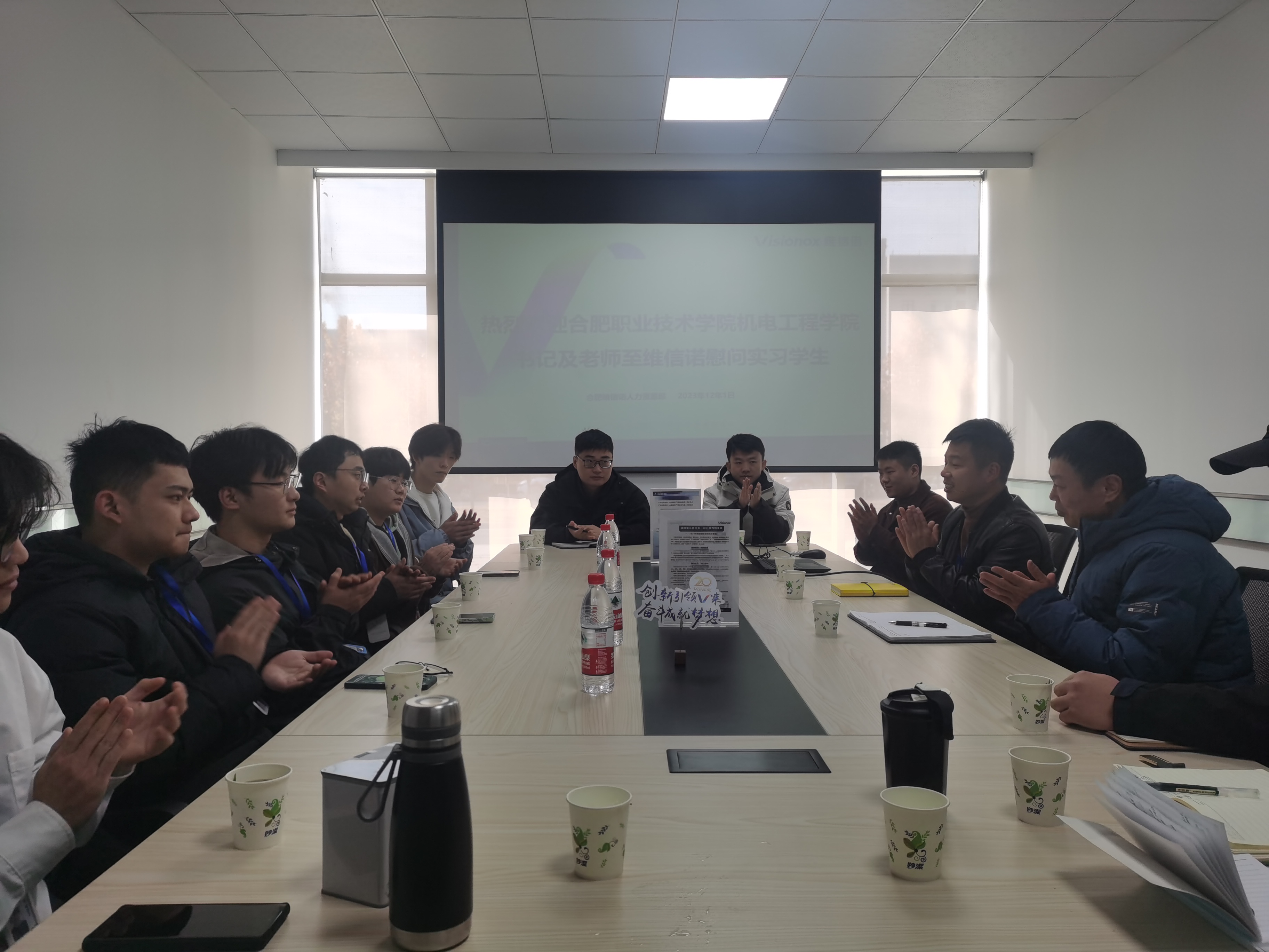 参会人员包含学院、学生和企业工作人员。22届机电一体化三班毕业生张宇作为企业方代表之一,也作为学长,首先向学弟们做了自我介绍,张宇表示学弟学妹们在企业内要努力工作,多多学习,也要和其他学长学姐、同学们多多交流沟通,以后有工作上、生活上的烦恼一定有问必答,一起在维信诺打响合职的名声,为校争先。人力经理也介绍了企业相关政策、实习生的薪酬与生活保障设施等,为企业员工做好最好的保障。针对老师们的提问,同学们也一一回答:专业课程与岗位的契合度是否足够?有同学表示在校学习的工业机器人、设备维护等知识是非常有用的,入职后可以很快上手岗位相关工作;同学们的技能是否有所成长?同学们表示从初入职场只能给师傅打下手,到现在可以独当一面,甚至有的同学自己也成为师傅了;同学们在岗位有没有什么话要对后届的学弟学妹们做特别提醒的?同学们表示一定要学好英文,因为很多技术名词、条文都是英文;和师傅相处的如何,能学到真本领吗?同学们表示,大多数师傅都是合职的学长学姐,很照顾,愿意无私的将技能传承下去。