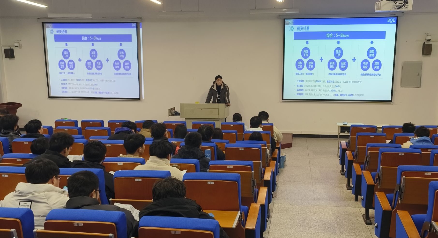 宣讲会上,京东方公司的HR负责人从企业的文化和历史出发,向同学们介绍了公司的薪资待遇、福利政策、晋升机制和其他一系列同学们关心的问题。同时,他还着重介绍了“现场工程师班”的相关信息,阐述了参加“现场工程师班”,对自身发展的有益之处,如获得更加系统的专业知识、提高实践能力并快速适应职场。此外,他还强调了校企合作的重要性,表示公司非常重视与高校的合作,希望能够与更多的同学建立联系,分享企业资源。