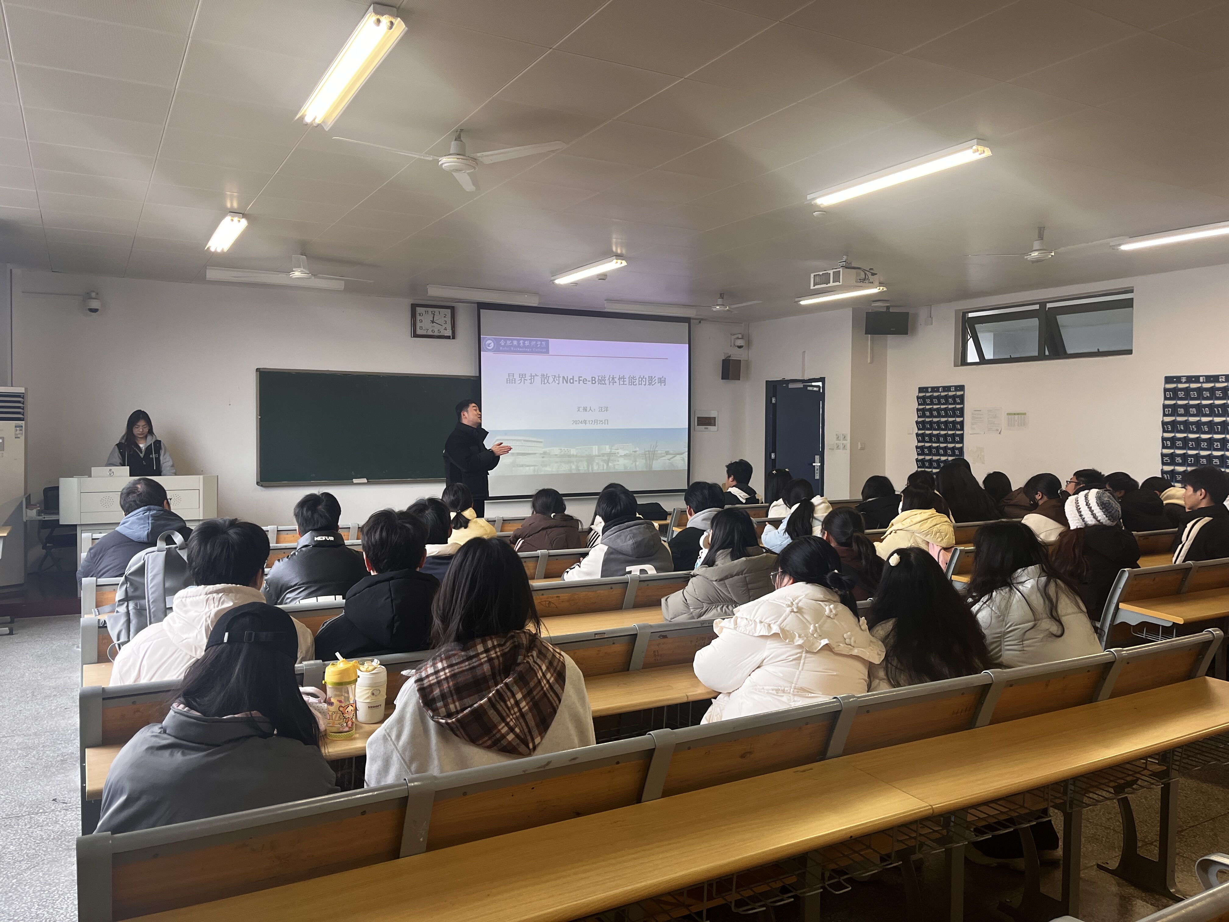 为加强对稀土永磁领域的认识、开阔师生科研视野,跟踪最新科研成果。2024年12月25日下午,由ballbet官网青年教师汪洋主讲的学术讲座在汇心湖校区教学南楼511教室顺利开展,本次讲座以“晶界扩散对Nd-Fe-B磁体性能的影响”为主题,学院各专业学生参加。