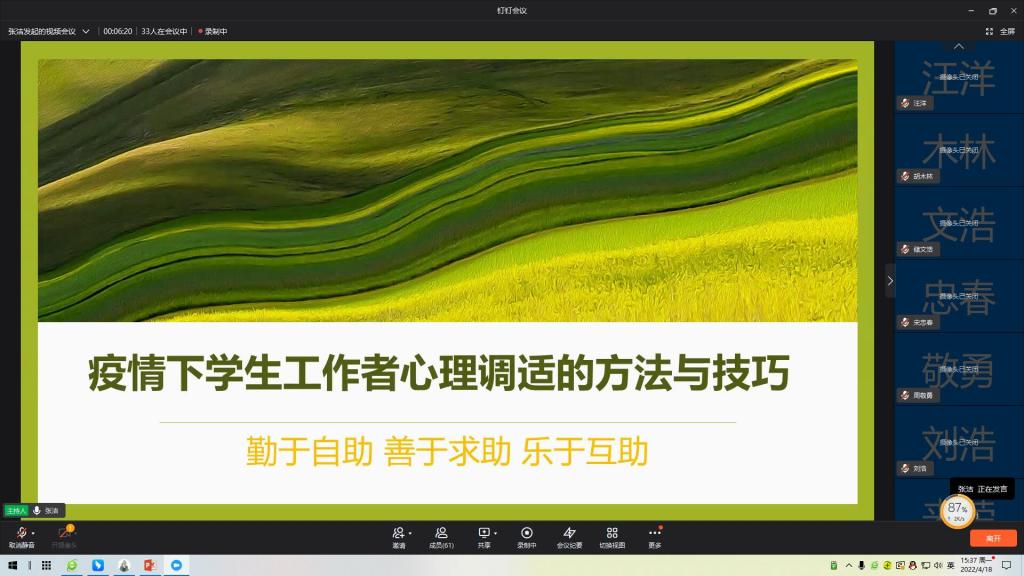 为使学生工作者勤于自助、善于求助和乐于互助,更好服务学生发展,4月18日下午,艾弗森贝博ballbet官网邀请校心理咨询中心主任张洁开展《疫情下学生工作者心理调适的方法与技巧》专题线上讲座。校党委委员、办公室主任王海,学院全体教职工、在校班级辅导员参加讲座,讲座由党总支书记王克勇主持。