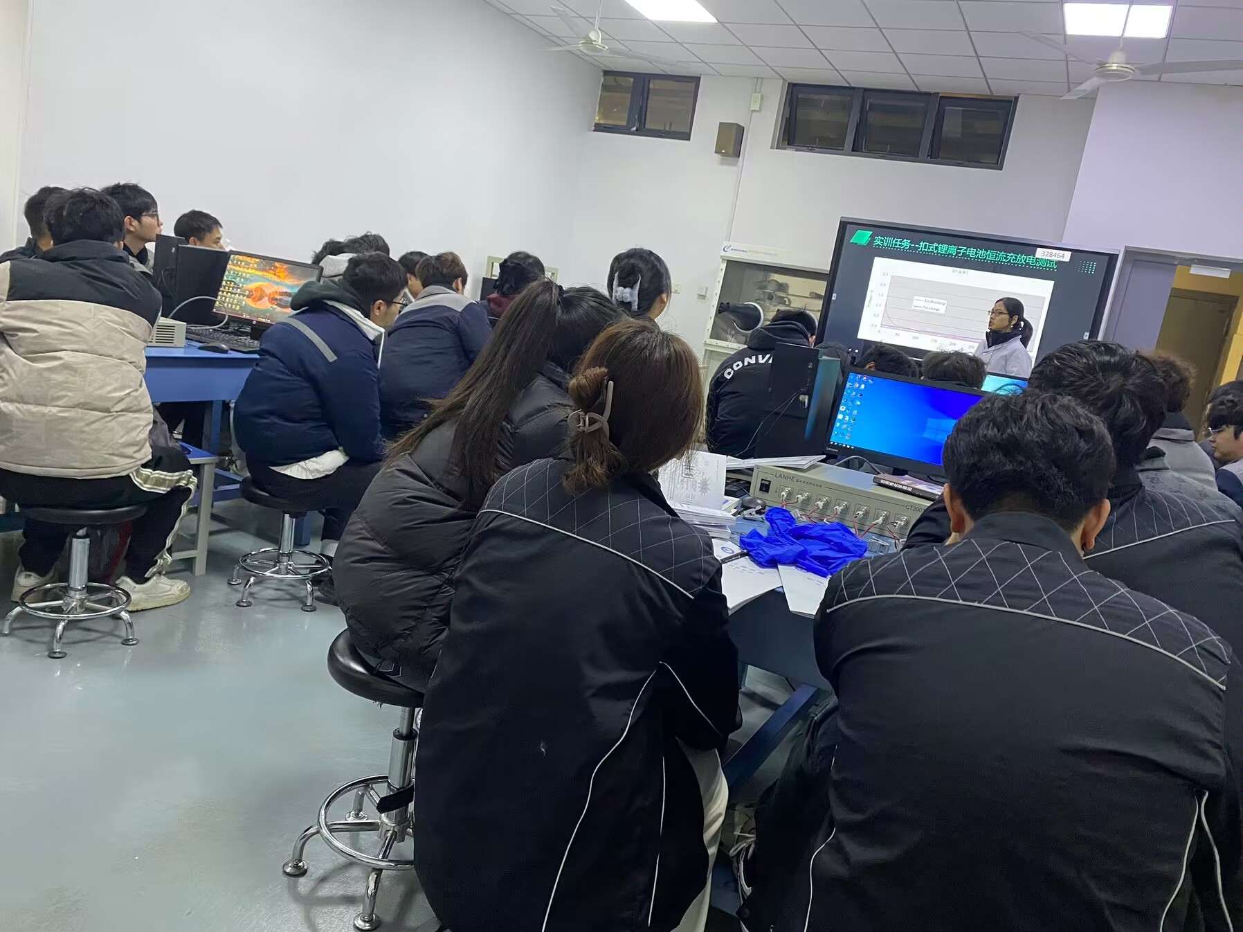 崔霞老师于24年01月10日上午在机电楼329教室给22储能班上了一节题为题为“恒流充放电测试”的实训课。在课上崔霞老师详细地介绍了锂离子电池的恒流充放电技术、蓝电充放电仪的使用。分别以教师准备的电池和学生按市售电池材料自己进行电极制备并组装的电池为测试对象,模拟锂电企业的电池化成过程,合理设置测试工步、测试参数和数据备份,完成电池的活化过程。使学生通过直观的感受学习了恒流充放电测试。