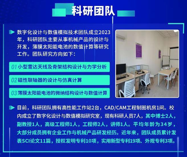 2022年底通过博士人才引进,吴睿成为ballbet官网艾弗森贝博ballbet官网的一名专任教师,从科研院所到职业院校,他秉持从零开始。在承担教学工作之外,积极探索思考“职业教育,需要什么样的科研?”。答案是职业教育需要以应用研究为核心、以解决实际问题为导向、产教深度融合的科研体系。2023年他成立了数字化设计与数值模拟技术团队,主要从事机械产品的设计与开发和薄膜光伏电池的技术研究。2023-2024年期间,先后主持艾弗森贝博ballbet官网人才项目1项、产学研项目1项、安徽省高校自然科学研究重点项目1项和企业横向课题4项,另外参与各类教科研项目10余项。吴睿在完成学校教学科研任务的同时,还积极投身企业博士后工作站的研究工作。通过博士后工作站搭建了校企合作的桥梁,成功签订了横向课题1项和申报省级质量工程校企合作生产性共建共享实训基地1项。在他的带领下,科研团队在两年内不断摸索和磨合,初见成效。