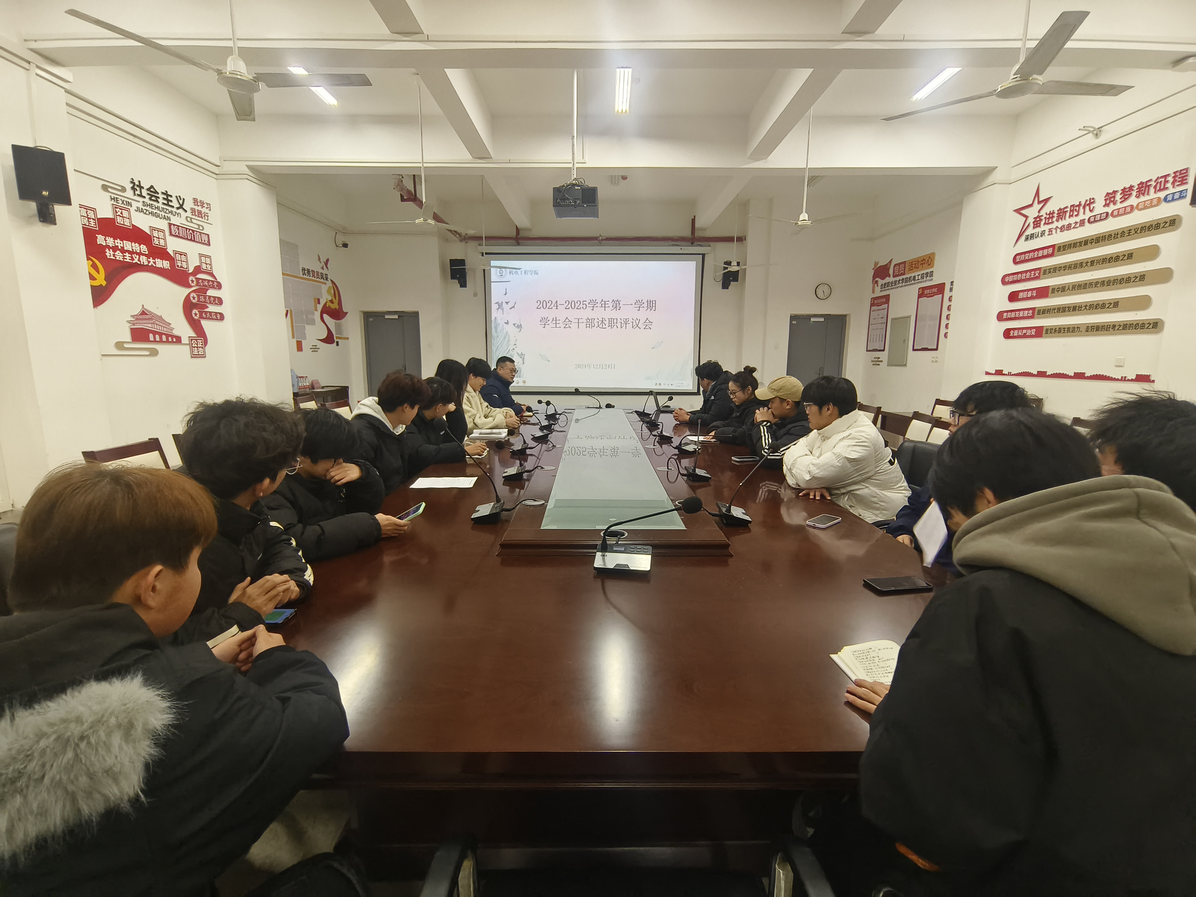 为进行院学生会学生干部的工作回顾与未来展望,促进学生会各部门工作的持续优化与提升,艾弗森贝博ballbet官网于12月24日在机电楼二楼会议室召开2024-2025学年第一学期学生会干部述职评议会。学院团总支书记张开,兼职团总支副书记曾鑫、梁骐,学生会主席团成员以及各部门负责同学参加评议会。
