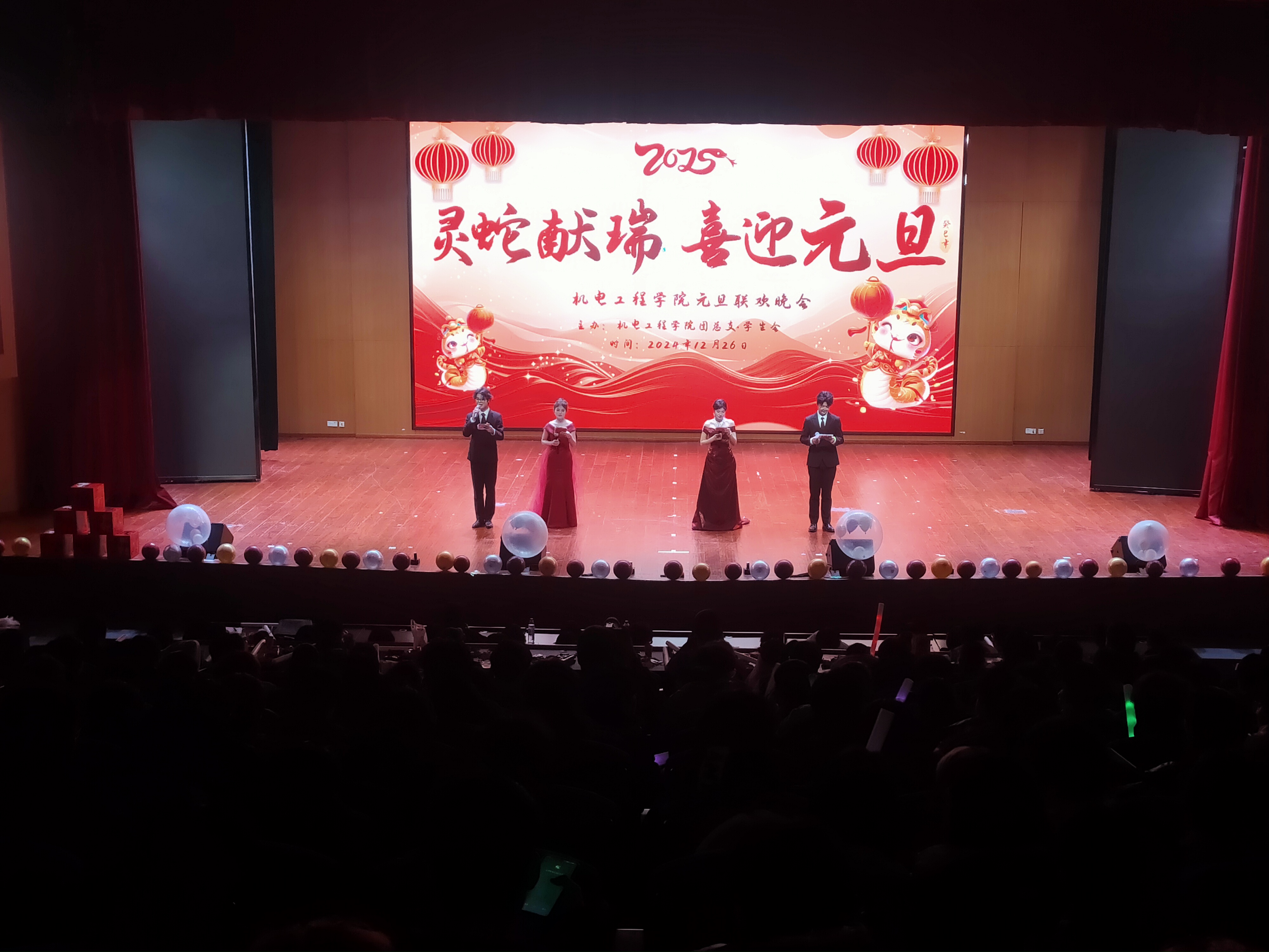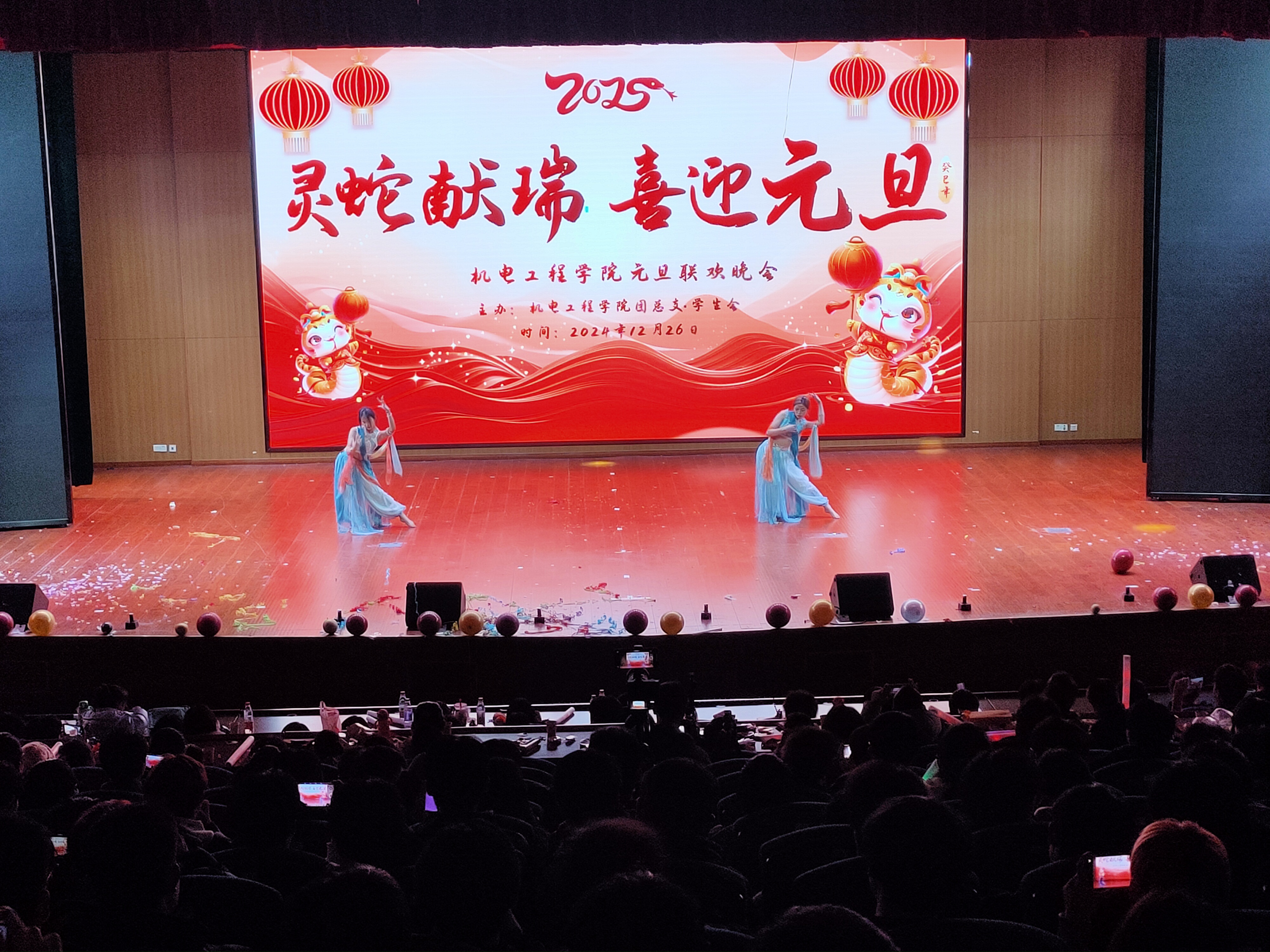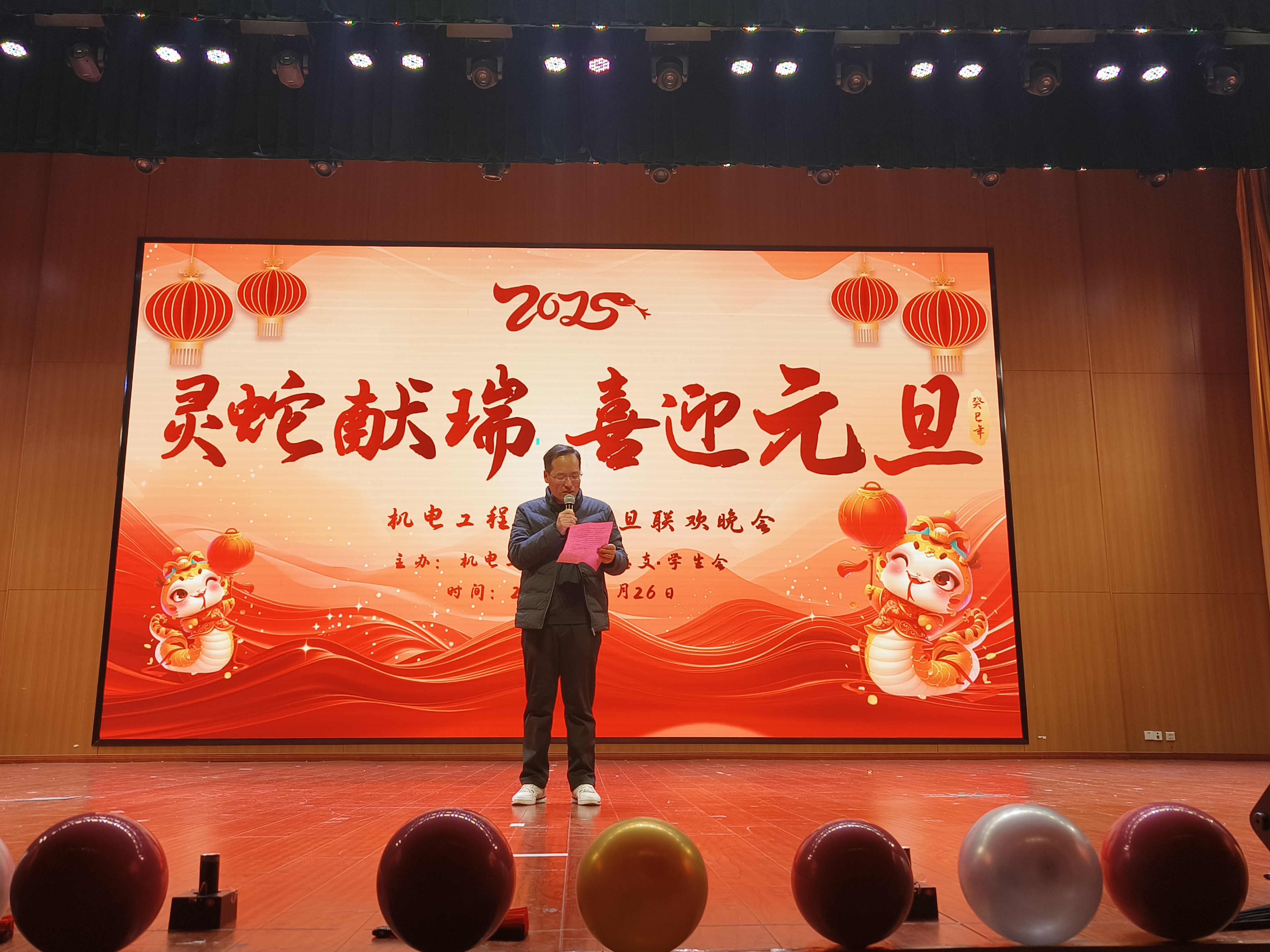 一元复始、万象更新。为弘扬中华优秀传统文化,营造文明和谐、喜庆祥和的新年气氛,充分展现青年学子风采,12月26日晚,艾弗森贝博ballbet官网在汇心湖校区大学生活动中心二楼报告厅举办“祥蛇献瑞 喜迎元旦”2025年元旦迎新晚会,师生们欢聚一堂,共同迎接新一年的到来。学院党政领导班子、全体专兼职辅导员、教师代表、学校和其他二级学院学生会代表以及400余名新生共同观看演出。