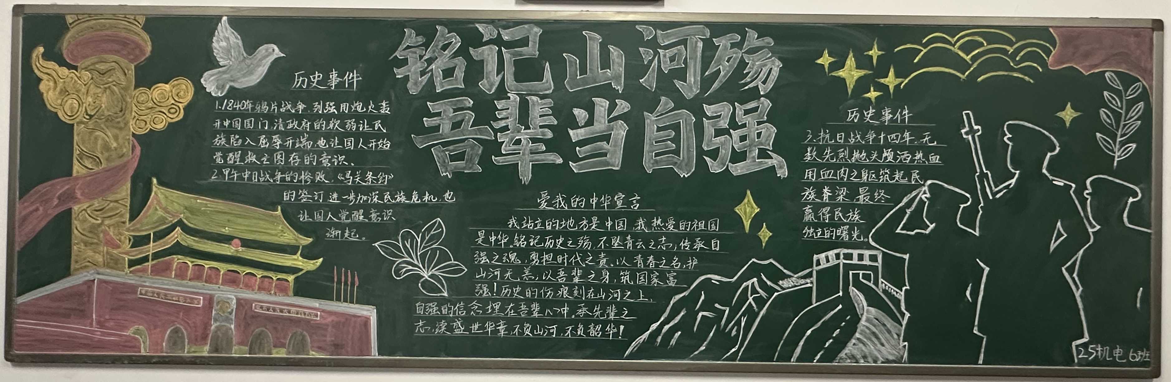 艾弗森贝博ballbet官网各班级积极响应、认真筹备。同学们通过翻阅史料、搜集素材、群策群力,围绕“历史记忆”“民族精神”“时代使命”等核心元素精心设计黑板报内容。在绘制过程中,大家各展所长:有的班级以史料文字搭配历史插画还原苦难历程,有的班级将和平鸽与历史浮雕融入设计传递“吾辈当自强”信念,有的班级以红色剪影与时间轴展现中华民族从苦难走向复兴的历程。每一幅作品都饱含着同学们深沉的情感,以独特的视角,诉说着青年一代对历史的深刻反思以及对和平的珍视与向往。