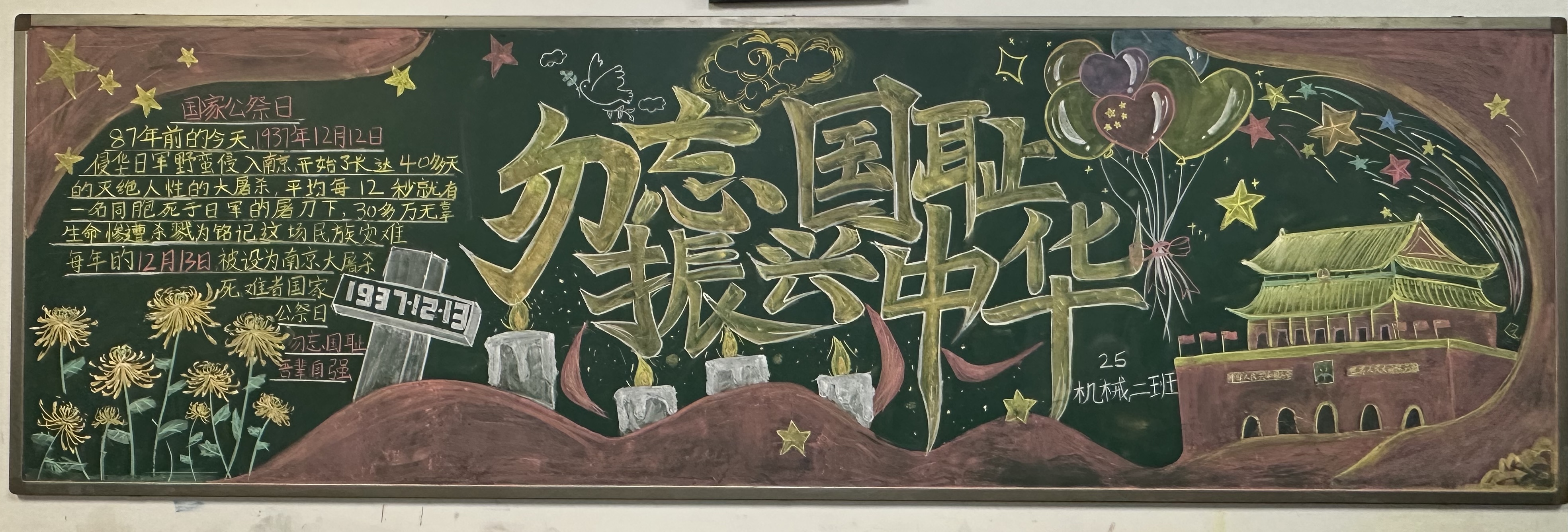 今年12月13日是我国第十二个南京大屠杀死难者国家公祭日。为引导学生重温民族苦难历史,缅怀遇难同胞,厚植爱国主义情怀,艾弗森贝博ballbet官网组织开展了“铭记历史 振兴中华”主题黑板报绘制评比活动。