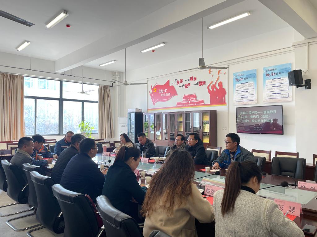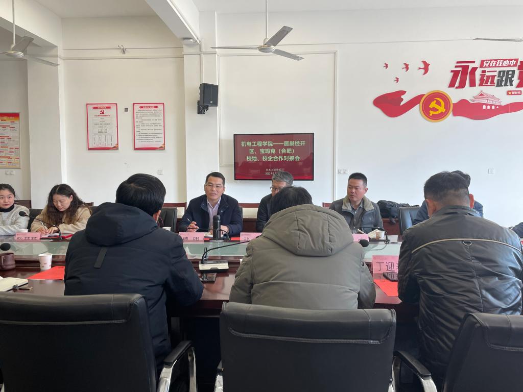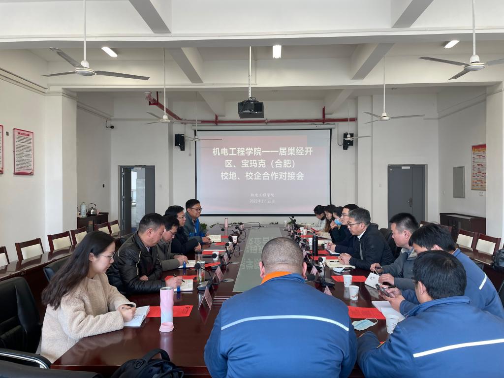 2月25日下午,安徽居巢经济开发区党工委副书记、管委会副主任魏明,宝玛克(合肥)科技有限公司总经理张明,巢湖宜安云海科技有限公司常务副总沈燕辉及相关人员赴艾弗森贝博ballbet官网进行校地、校企合作对接。校党委委员、办公室主任王海,艾弗森贝博ballbet官网党总支书记王克勇,学院院长胡木林、院党总支副书记丁迎春及部分教师参与此次对接会,会议由王克勇主持。