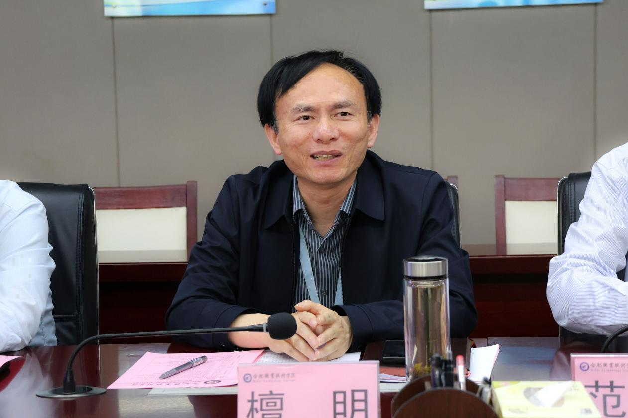 校长檀明致辞。檀明首先代表学校对来访的嘉宾表示热烈的欢迎,对政府部门、企业方在合肥(新站)高新技术产教联合体、四大产教联盟等工作开展的支持表示感谢。檀明指出,此次政、校、企合作交流、校企合作签约暨人才培养基地授牌是聚焦推进产教联盟十三项重点任务,围绕现场工程师培养,实现校企协同育人实质性成果之一。檀明强调,学校对专业人才的培养,要契合合肥市、新站区产业发展,注重品牌效应,并期望以此次活动为契机,在政府指导下、企业协同下提升学校办学层次,在应用型科研团队、社会培训等方面进一步扩宽校企产学研合作深度与广度。