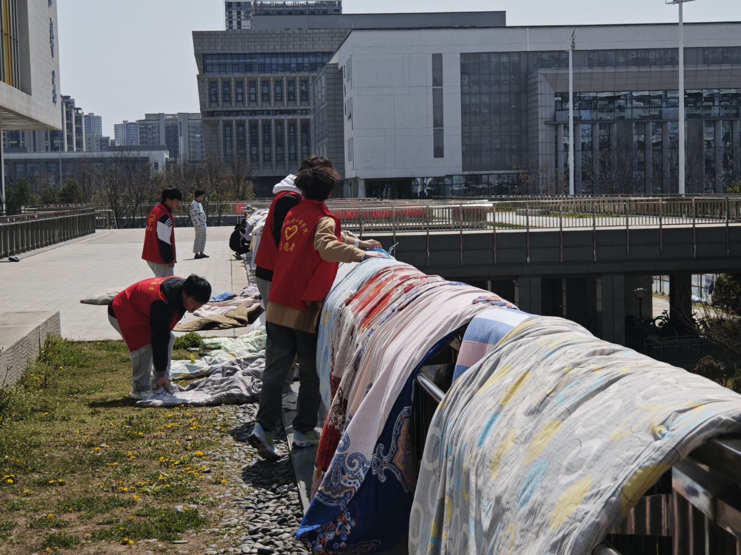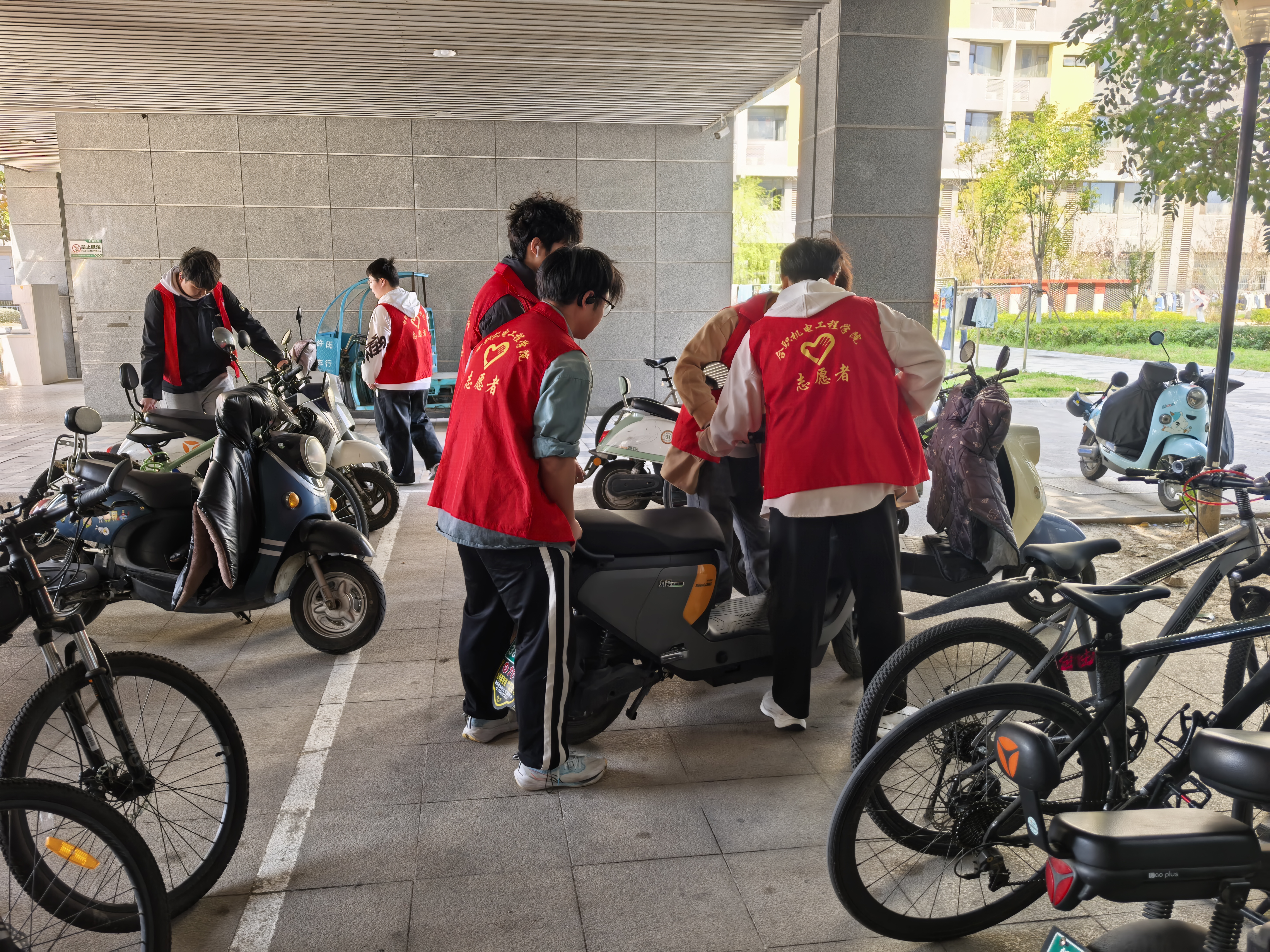 车辆整理组的志愿者重点对食堂周边乱停放的电动车、自行车进行规范整理。他们将车辆逐一调整至指定区域,对齐车头方向,清理占道车辆。经过两小时的细致工作,原本杂乱的停车区变得整齐划一,校园道路也更加通畅。生活帮扶组的志愿者们则关注同学们的日常生活需求。针对宿舍区晾晒被褥频繁被风吹落的问题,他们逐栋巡查,拾取被风吹至地面或树枝上的被子,用消毒湿巾擦拭表面灰尘后,重新用加固夹固定于晾衣架。