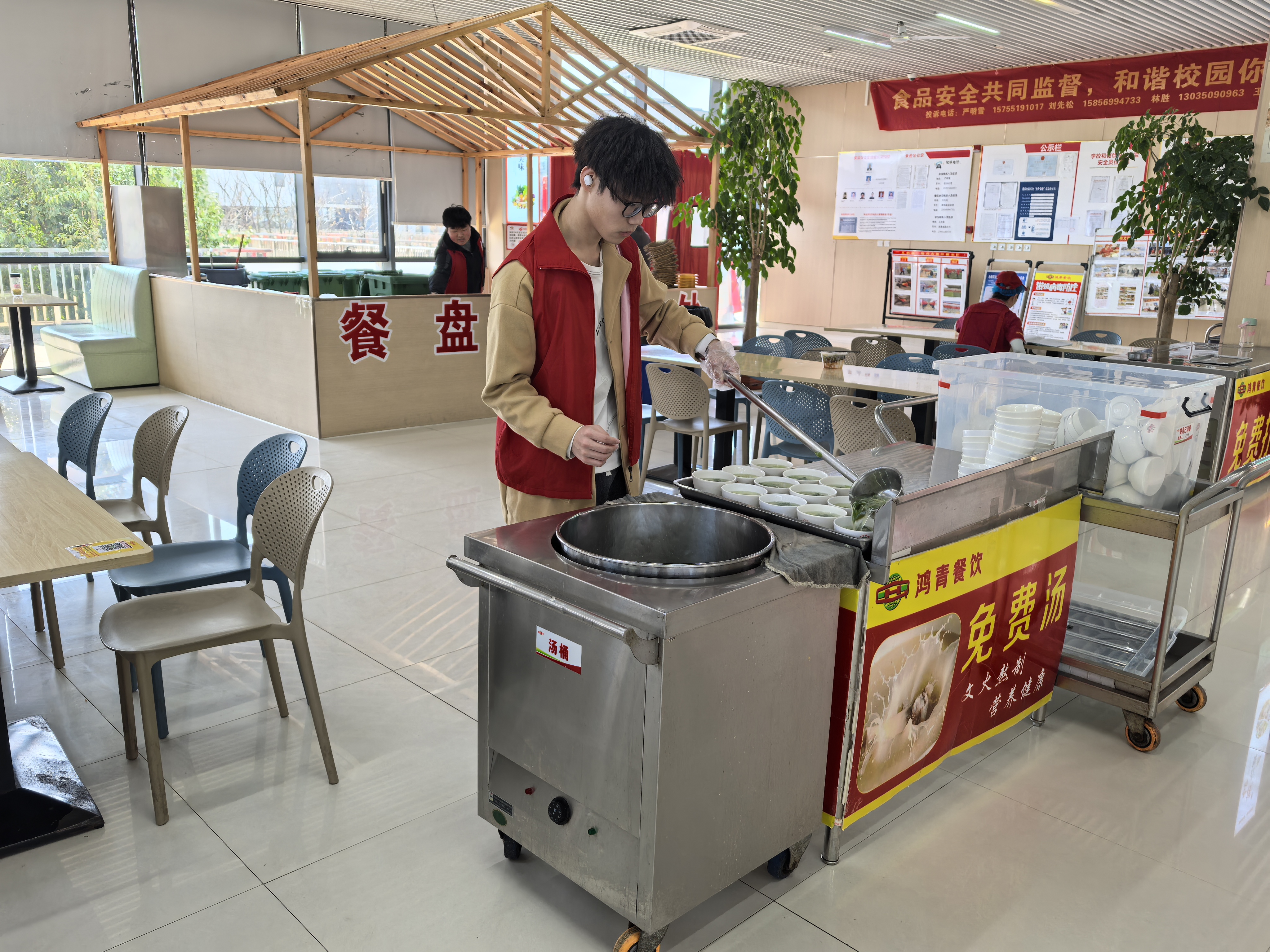 活动开始,艾弗森贝博ballbet官网团总支对志愿者进行了分组培训与任务分工,明确各小组职责,分为“食堂服务组”“车辆整理组”“生活帮扶组”三支队伍,分头行动。食堂服务组的志愿者们在食堂一、二楼忙碌有序。他们协助工作人员清理餐桌、擦拭地面,针对餐后残留食物和餐具及时回收整理,确保就餐环境干净卫生。此外,他们在免费汤品区为同学们提供暖心服务。