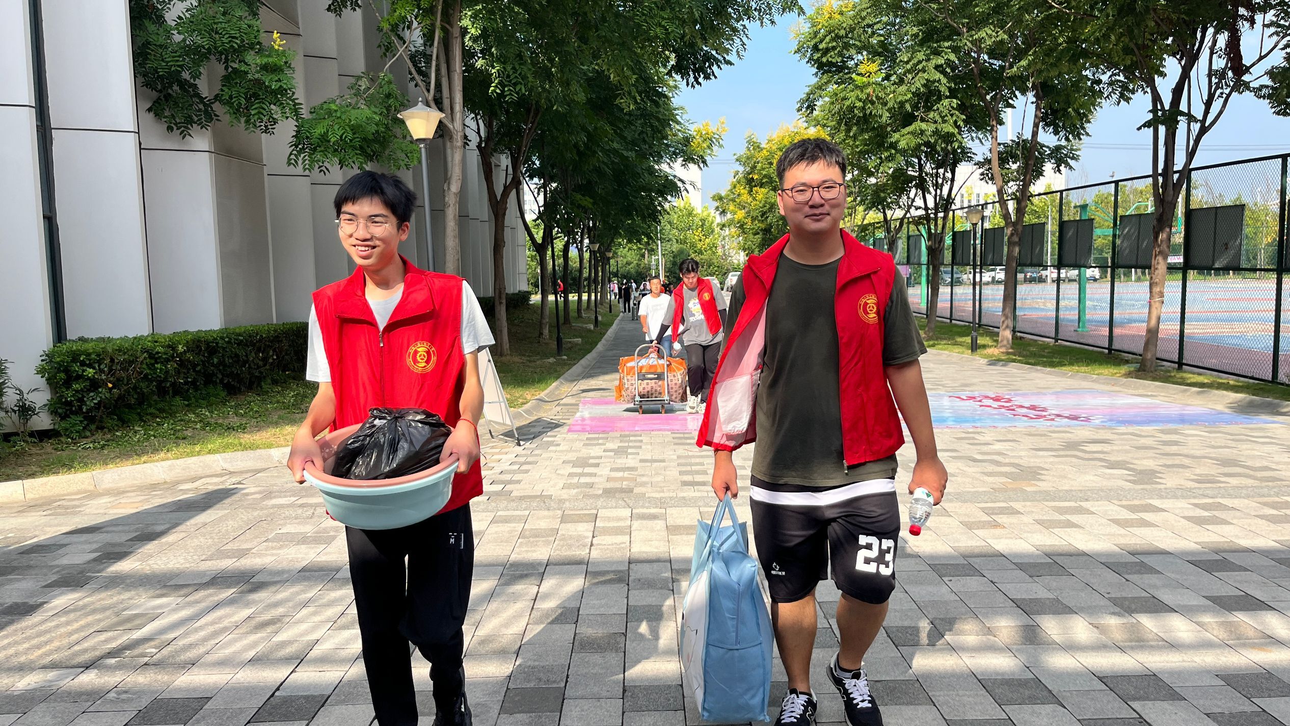 迎新前夕,学院高度重视2023级新生报到工作,早在新生报到前,学院师生们已经开始积极地为迎新工作做准备。他们尽心尽力,只为妥善安排迎新现场的每一处细节。伴随着朝阳初升,志愿者们早早来到迎新场地,他们穿上红马甲上岗工作,穿梭在校门与报到地之间,忙碌的身影随处可见。指引方向、介绍学校各建筑、搬运行李、收取相关材料、发放新生物品……他们以最饱满的热情迎接新生的到来,用最亲切的话语为新生带来温暖,细致的服务保证了迎新工作的顺利进行,也舒缓了新生们初次来到陌生校园时的焦虑与不安。