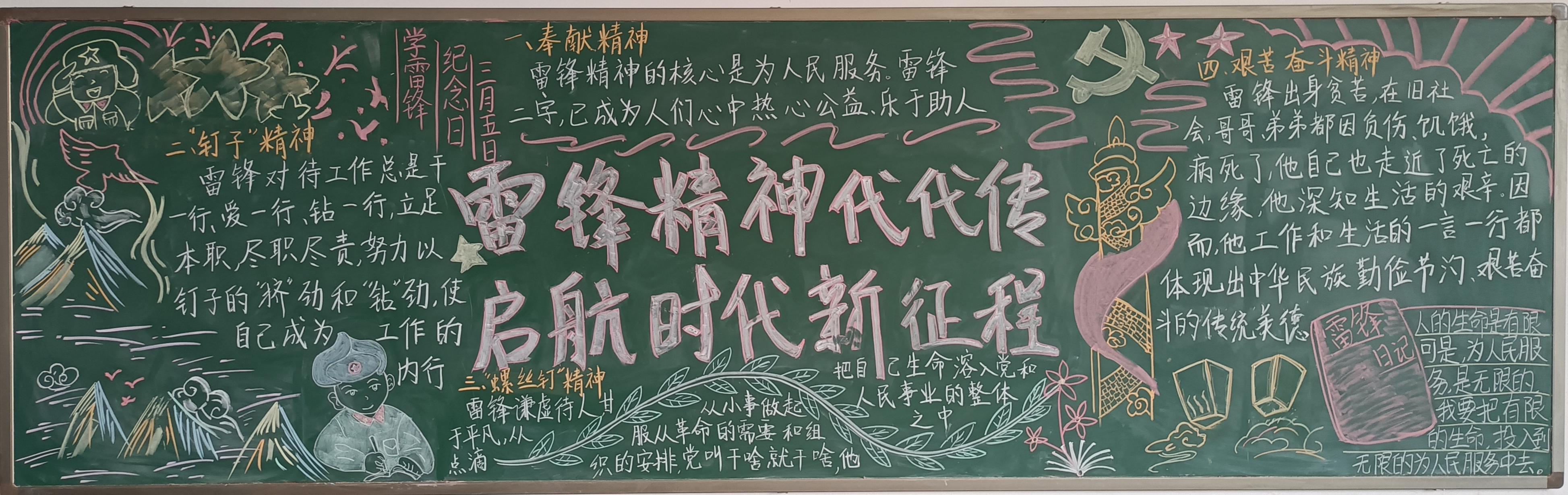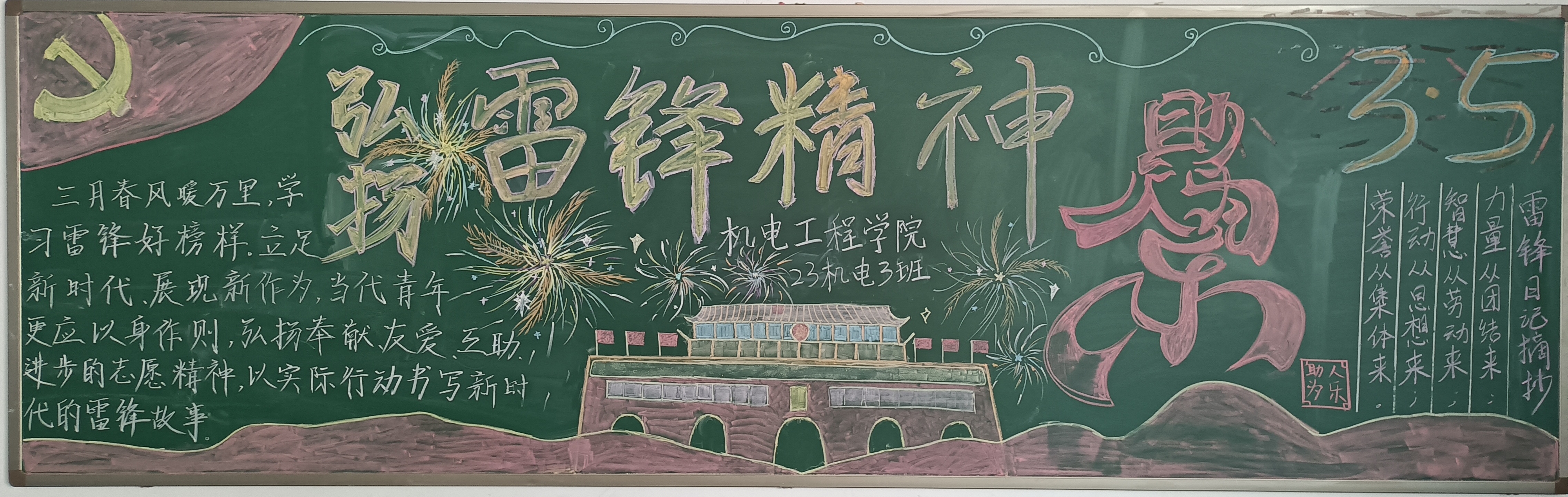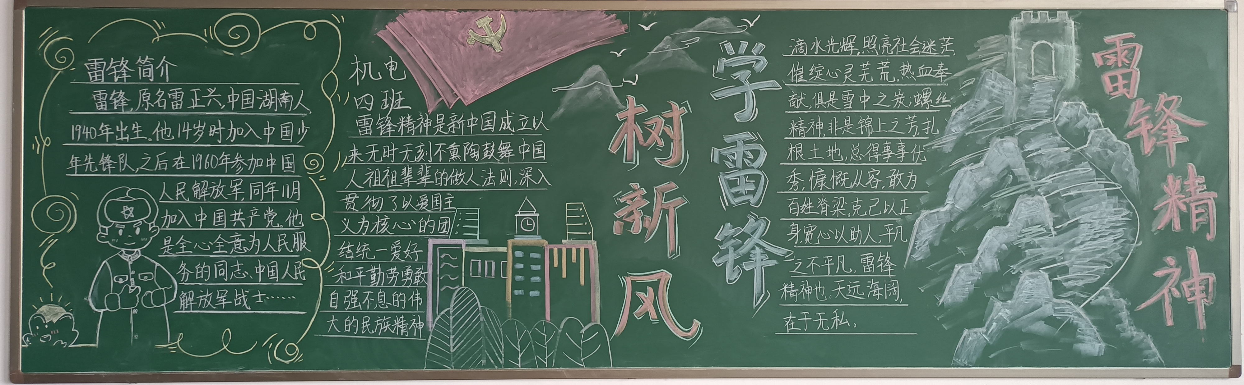 在活动过程中,各班同学群策群力、精心设计,把对雷锋的敬仰之情,都融入一块块美观大方、主题突出、图文并茂、创意新颖的黑板报里,学生的心灵再一次被雷锋的“钉子精神”,“全心全意为人民服务”等品质洗礼。经过最后的评比,23机械2班获得一等奖;23机电4班、23储能班获得二等奖;23机械3班、23焊接1班、23智控班获得三等奖。