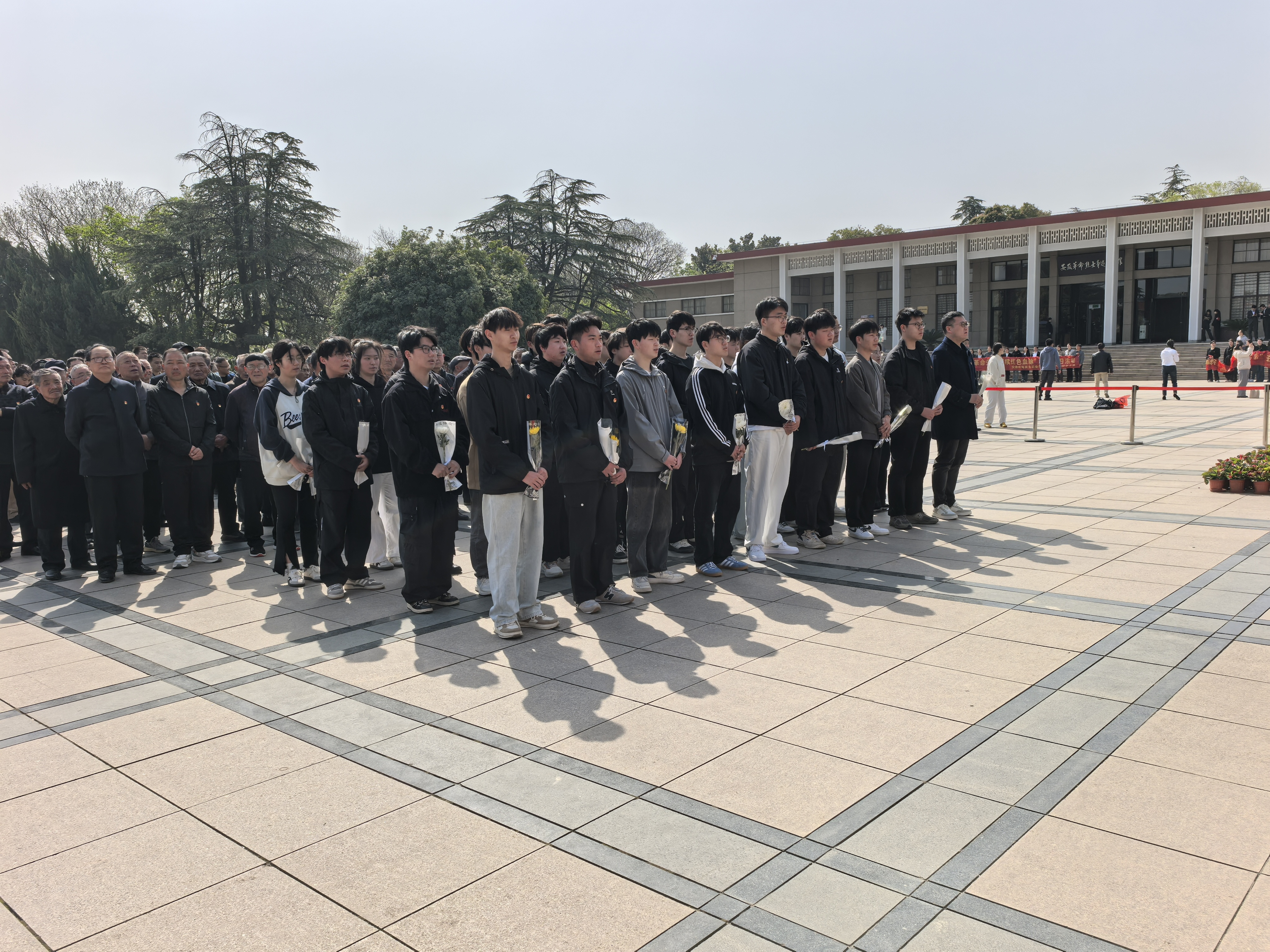 陵园寄情,誓守初心。全体师生整齐列队,垂首默哀,向为民族独立与人民解放献出生命的英烈致以崇高敬意。随后,每排人员缓步上前敬献鲜花,黄白菊花交织,寄托哀思与追念。在鲜艳的党旗前,全体师生面向纪念碑庄严宣誓,誓言铿锵,回荡于蜀山陵园上空,彰显了青年一代的信念与担当。