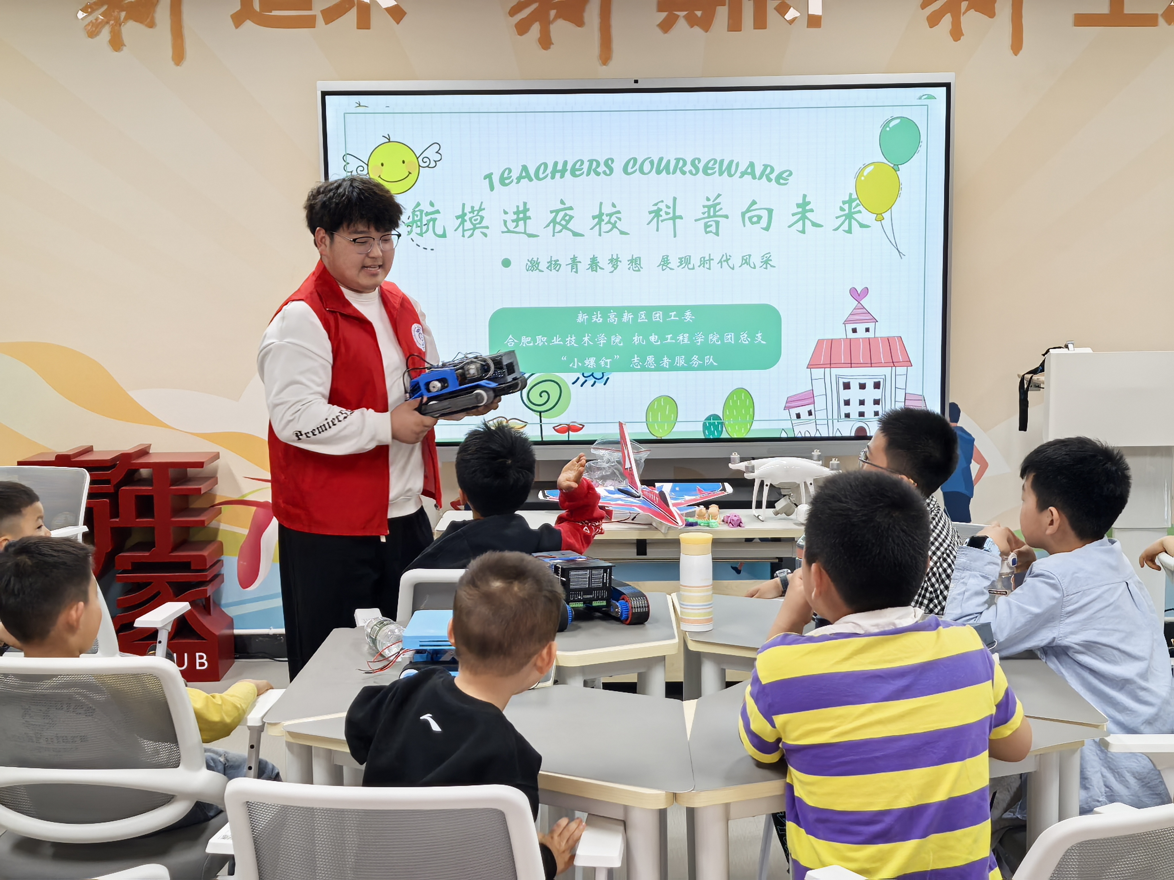 航模腾空传科技,科普互动育童心。为切实提高社区青少年儿童的思想政治素质和科学文化素质,增强在校大学生动手实践与团队协作能力,激发创新思维与探索精神。4月26日下午,艾弗森贝博ballbet官网“小螺钉”志愿服务队12名志愿者走进合肥新站高新区工人文化宫,为社区孩子们带来了一场别开生面的科普教育志愿服务活动。