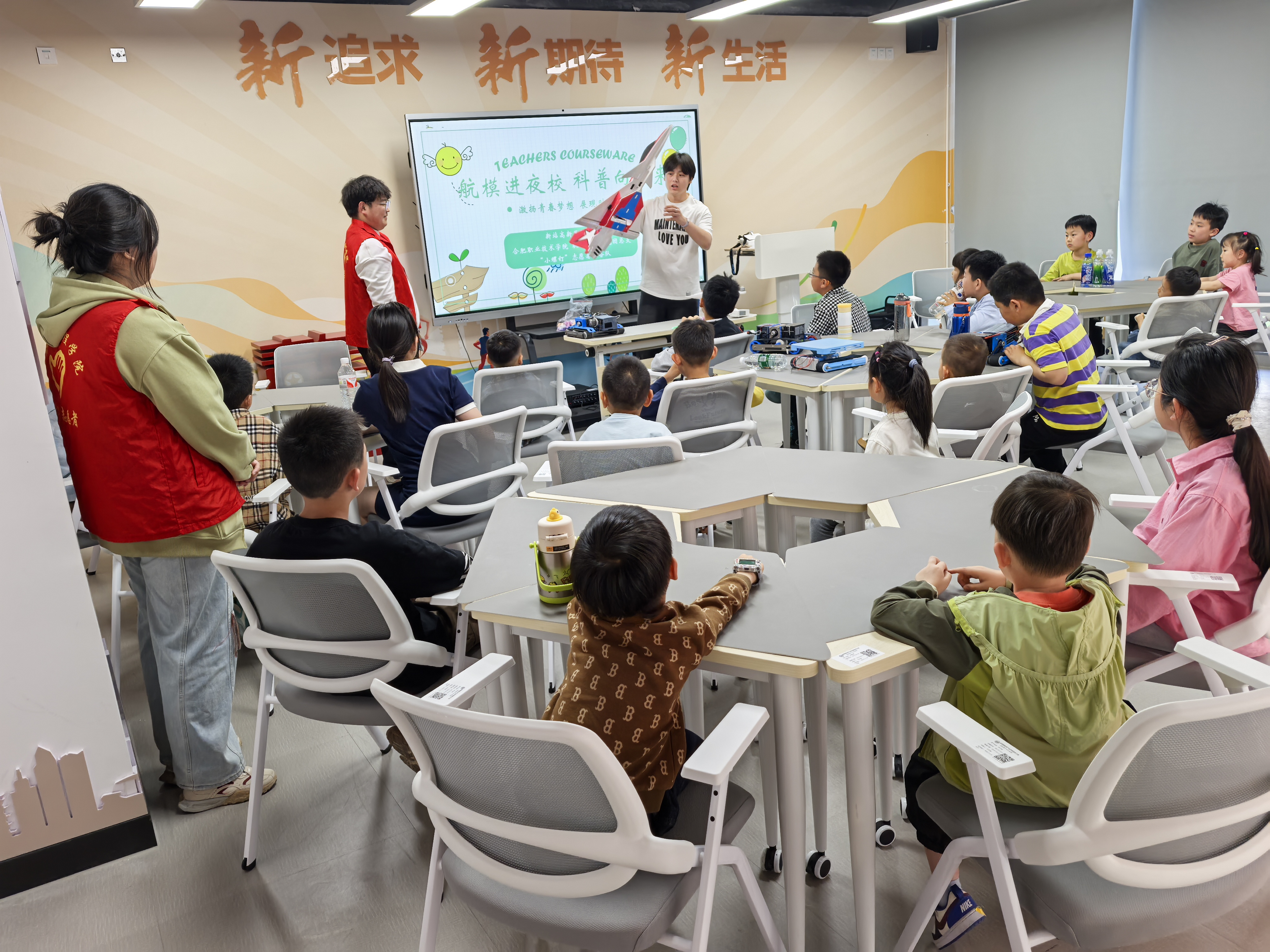 活动开始,志愿者们先进行了模型飞机制作的培训。随后,陈化伟同学为小朋友宣讲航模知识,从歼10到歼20,战斗机的迭代更新展现了国家发展的快速步伐。他借助实例模型、视频,提问等方式与在场孩子们积极互动。当屏幕上出现歼-20翱翔的英姿时,现场响起阵阵惊叹。“哪位小朋友知道歼-20的独特优势?”陈化伟同学话音刚落,一只只小手便高高举起。“隐身能力超强!”“速度快,战斗力顶尖!”孩子们的回答充满自信,现场气氛十分热烈。